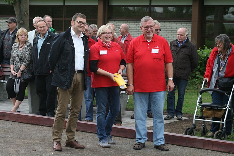 Mit nur einem Saldopunkt weniger und ebenfalls drei Siegen sicherten sich die Lokalmatadoren Josef Evers und Thies Hoffmann („Bouletten“ Borgentreich) den zweiten Platz vor Guido Grube und Christoph Bockermann, ebenfalls von den Boulefreunden Lütmarsen. Karl Rohde und Ulrich Ehle (Eggebouler Bonenburg) belegten mit ebenfalls drei Siegen, aber weniger Saldopunkten den vierten Platz. Alles hatte so nett angefangen: wohlpräparierter Platz, bedeckter Himmel („wenigstens nicht so eine Hitze wie sonst in Körbecke“) und 28 spielfreudige Doublette-Teams aus dem ganzen Kreis Höxter. Ehrengast Landrat Michael Stickeln wünschte den Teilnehmenden viel Erfolg und ließ sich ausführlich über den Boulesport im Kreis Höxter informieren. „Ich bin beeindruckt, wie stark diese Randsportart hier im Kulturlandkreis Fuß gefasst hat. Dieser Sport ist gesellig, verbindet Männer und Frauen jeden Alters und macht auch vor Menschen mit Handicap nicht Halt.“ Denn die Bouleturniere der BSG Borgentreich sind die einzigen im Kreis, bei dem immer Teams der Lebenshilfe für Geistig Behinderte voll integriert sind.